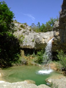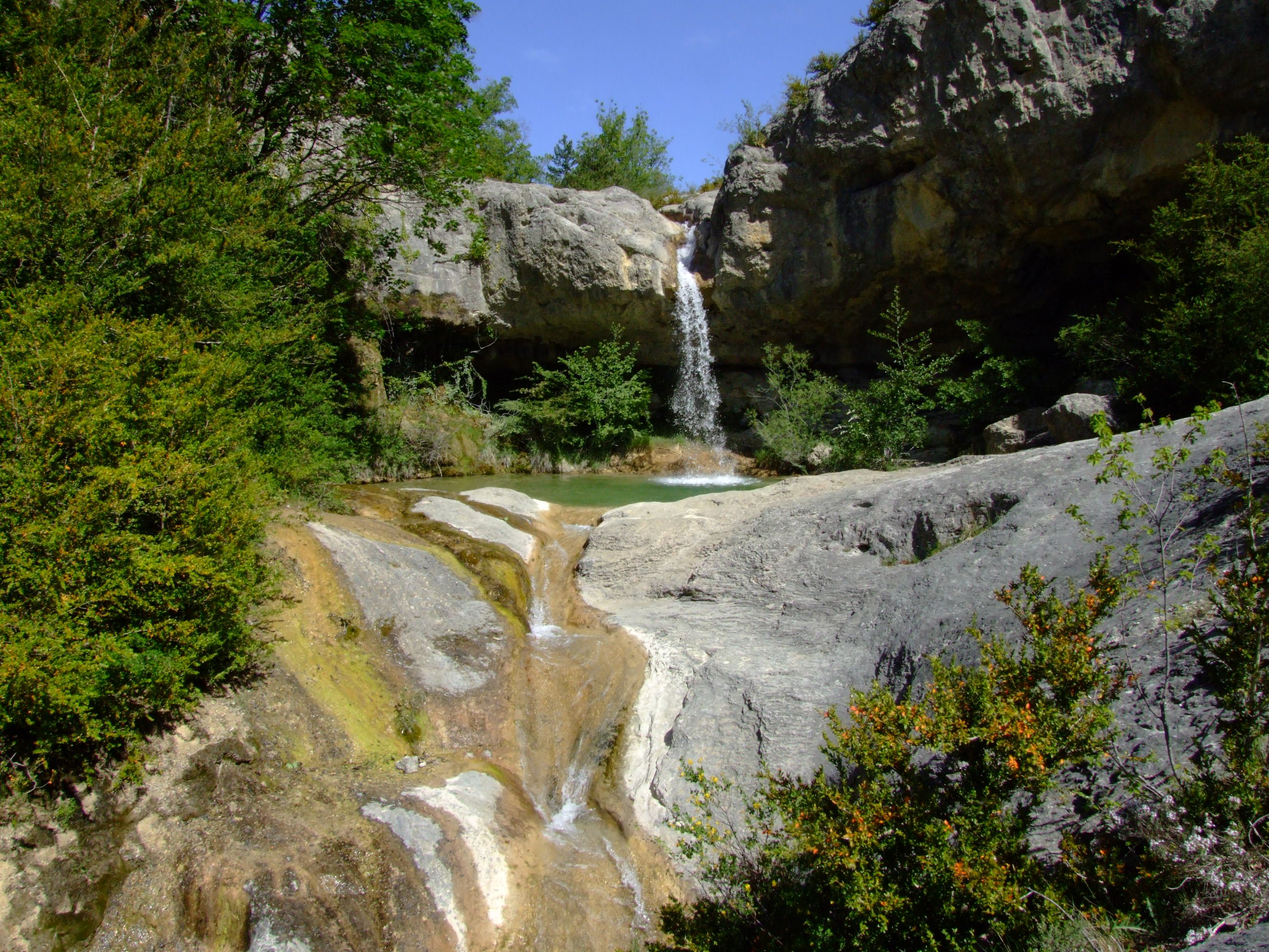 On peut accéder sous la troisième cascade : la strate calcaire forme un bel abri-sous-roche